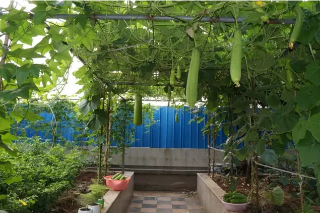 “雙童”的屋頂菜園有700多平方米,種著(zhù)二三十種蔬菜!南瓜、絲瓜、苦瓜、冬瓜、辣椒…… 菜園子里的蔬菜真是應有盡有,自家種的菜,在眼皮子底下發(fā)芽成長(cháng),開(kāi)花結果,安全放心!