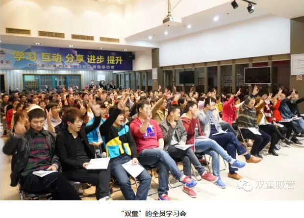 “雙童”一直倡導建設學(xué)習型企業(yè),營(yíng)造學(xué)習氛圍,每周召開(kāi)兩次全體員工的學(xué)習會(huì ),分批次分部門(mén)開(kāi)展班組部門(mén)學(xué)習會(huì ),通過(guò)企業(yè)文化書(shū)籍、意識形態(tài)、制度培訓、技能培訓等各個(gè)方面,對員工開(kāi)展學(xué)習培訓。無(wú)論是掃地阿姨還是看門(mén)叔叔,都必須參加全員學(xué)習會(huì ),感受學(xué)習氛圍!