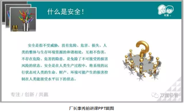 說(shuō)完了企業(yè)文化,安全工作也是必不可少!廠(chǎng)長(cháng)通過(guò)員工的安全生產(chǎn)職責、生活安全注意事項、消防安全等方面詳細地講解了安全知識的重要性,并通過(guò)一些令人警醒的案例提醒員工們工作生活中一定要注意安全。