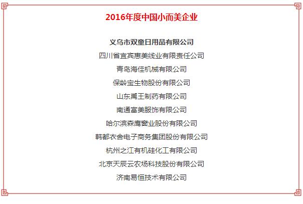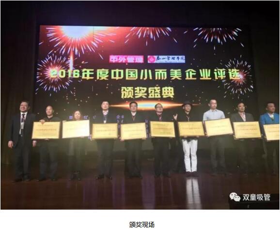 2月26日下午,當家人樓總和二當家李總受邀前往《中外管理》雜志社與泰山管理學(xué)院聯(lián)合舉辦的2016年度中國小而美企業(yè)頒獎盛典。此次評選有全國各地56家隱形冠軍企業(yè)的參選申請,經(jīng)過(guò)專(zhuān)家評審委員會(huì )的評選,共有11家企業(yè)脫穎而出,榮獲“2016年度中國小而美企業(yè)”,“雙童”也名列其中!
