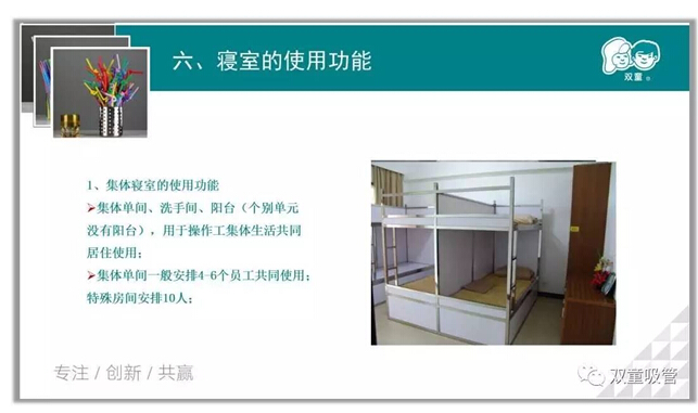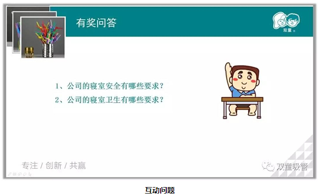 張講師一開(kāi)場(chǎng)就介紹了各類(lèi)寢室的配置及安排補貼原則。瞧瞧!員工們聽(tīng)得多認真呀!一到了問(wèn)答環(huán)節,個(gè)個(gè)都很積極呢,公司的寢室分為哪幾種?具體又是怎么安排分配的?員工們都對答如流,直呼咱們“雙童”的居住環(huán)境真的很棒!是呀,“雙童”的寢室建立之初就按照三星級酒店的標準裝修,讓員工們能夠住的開(kāi)心住的舒心!