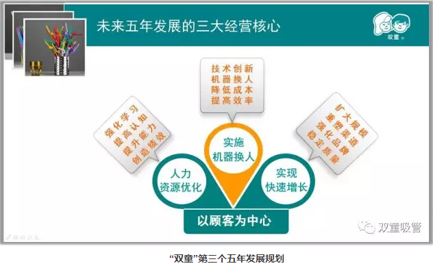 “雙童”堅持走專(zhuān)業(yè)化的發(fā)展道路,堅守實(shí)業(yè),不多元,不浮躁,不急功近利,強調“以小博大”,“博”不是拼搏的搏,而是博大的博,就是要以博大的胸懷將一根吸管做精、做強、做到極致。