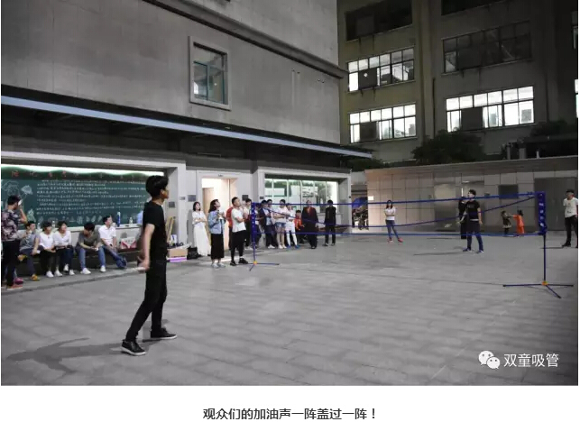 隨著(zhù)羽毛球的上下起落,現場(chǎng)的觀(guān)眾們比選手還緊張呢!男生給女生加油,女生為男生吶喊,連“雙童”寶貝都加入了“啦啦隊”,加油聲一陣蓋過(guò)一陣,現場(chǎng)氣氛可真是熱鬧呢!不少社員們都說(shuō)現在的社團活動(dòng)是越來(lái)越有意思啦!