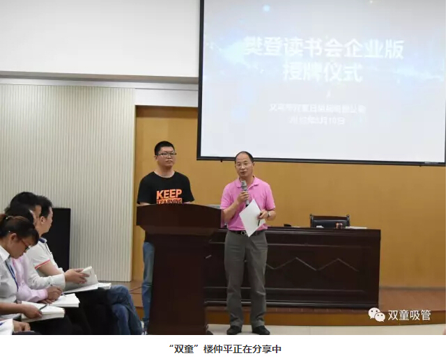 其實(shí),這次的授牌儀式并不是臨時(shí)起意,而是淵源頗長(cháng)。早在去年樊登讀書(shū)會(huì )剛成立之初,“雙童”樓仲平就已經(jīng)關(guān)注并加入了樊登讀書(shū)會(huì )。據樓總自己介紹,自從加入樊登讀書(shū)會(huì ),他就將每天早晚的兩個(gè)小時(shí)走路鍛煉時(shí)間與之相結合,邊鍛煉邊學(xué)習,通過(guò)樊登讀書(shū)會(huì )的說(shuō)書(shū)音頻,每天都可以聽(tīng)一本精彩的書(shū)籍,學(xué)習到了許多有用的知識。