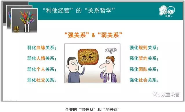 作為企業(yè),我們應該如何去重構“關(guān)系”?可能有許多人會(huì )馬上想到萬(wàn)科王石的“弱關(guān)系”理論,但是我認為王石只說(shuō)對了一半。因為在中國這樣的大環(huán)境下,企業(yè)不可能不用關(guān)系來(lái)取得成長(cháng)。但是作為企業(yè)管理者和經(jīng)營(yíng)者,我們應該要學(xué)會(huì )如何引導企業(yè)來(lái)分清“強關(guān)系”和“弱關(guān)系”。下面我就重點(diǎn)來(lái)闡述“雙童”的“關(guān)系哲學(xué)”理論!