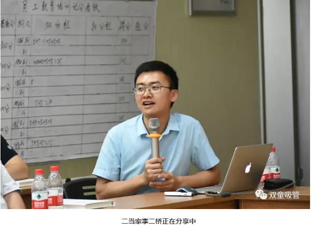 2003年11月,李二橋被任命為吸管車(chē)間班組長(cháng),負責吸管車(chē)間六七十號員工的生產(chǎn)安排和質(zhì)量控制。由于工作出色,2005年8月,剛滿(mǎn)20歲的李二橋就進(jìn)入“雙童”中層行列,被任命為品管部主任,開(kāi)始承擔起標準化制定的工作。