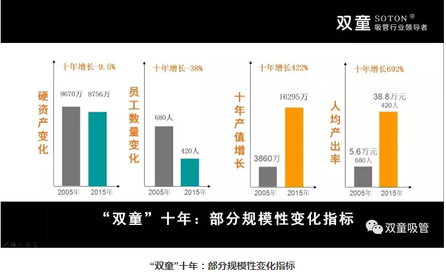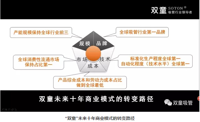 所以,未來(lái)十年,“雙童”將繼續轉變商業(yè)模式,在規模上保持適量擴張,實(shí)施機器換人提高產(chǎn)出效率,重塑流通渠道,提高市場(chǎng)占比。