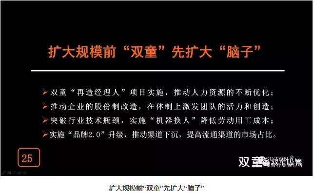 “適當的規模”未必跟硬資產(chǎn)規模、產(chǎn)值、員工數成正比,不同行業(yè)對企業(yè)“適當的規模”應該有不同的認知和判斷,根據企業(yè)經(jīng)營(yíng)“時(shí)間軸”變化做相應調整來(lái)改變“雙童”未來(lái)在行業(yè)當中的地位!