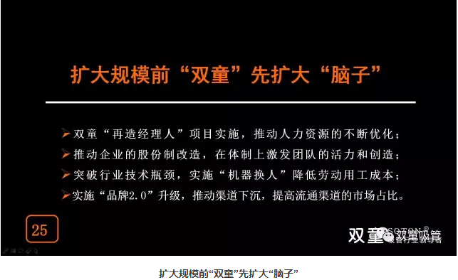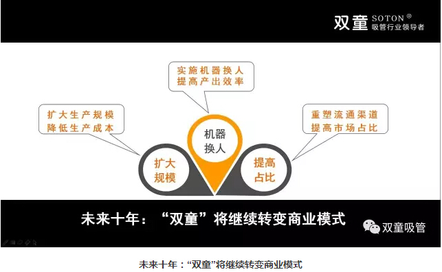 未來(lái)十年,“雙童”將繼續轉變商業(yè)模式,在規模上保持適量擴張,實(shí)施機器換人提高產(chǎn)出效率,重塑流通渠道,提高市場(chǎng)占比!“適當的規模”未必跟硬資產(chǎn)規模、產(chǎn)值、員工數成正比,不同行業(yè)對企業(yè)“適當的規模”應該有不同的認知和判斷,根據企業(yè)經(jīng)營(yíng)“時(shí)間軸”變化做相應調整來(lái)改變“雙童”未來(lái)在行業(yè)當中的地位!
