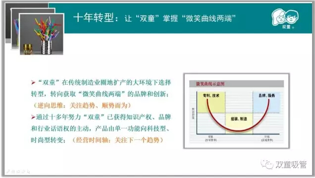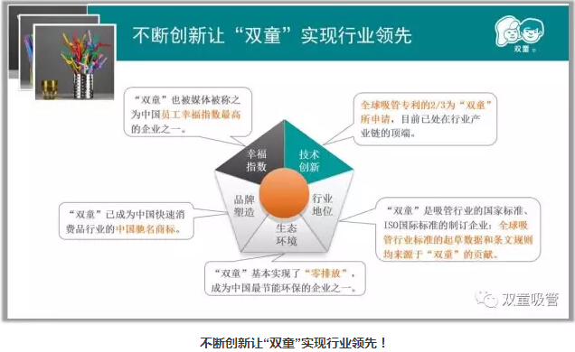 “雙童”的這些改變實(shí)際上是商業(yè)模式的創(chuàng )新,基于商業(yè)價(jià)值和產(chǎn)業(yè)鏈進(jìn)行創(chuàng )新。除了商業(yè)模式的創(chuàng )新之外,另一方面,“雙童”的創(chuàng )新都來(lái)源于基層和實(shí)踐,員工們每天都在想吸管除了喝飲料還能干什么,結合基層和實(shí)踐來(lái)獲得靈感。目前,我們發(fā)明了愛(ài)心吸管、卡通吸管、風(fēng)車(chē)吸管、音樂(lè )吸管、眼鏡吸管等創(chuàng )新吸管,擁有了100多項專(zhuān)利,掌握了全球吸管行業(yè)近2/3的專(zhuān)利,并且主導著(zhù)全球吸管行業(yè)的行業(yè)標準制定。