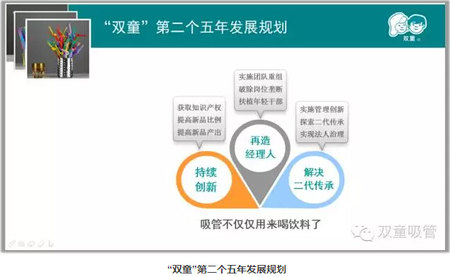 現在,公司有二三十個(gè)中高層,平均工齡10年以上,年齡30歲左右,都是我一個(gè)個(gè)帶出來(lái)的,“雙童”做的吸管是一個(gè)比較偏門(mén)的行業(yè),沒(méi)有行業(yè)的通用性人才,所以我們基本不用空降兵。這批人是我帶出來(lái)的,就深受我的影響,在乎工作、可以放下身段,整體素質(zhì)遠超第一代管理者。這批第二代管理者培養起來(lái)后,至少打開(kāi)了“雙童”未來(lái)二十多年企業(yè)持續發(fā)展的窗口。