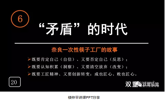 “矛盾”的時(shí)代:“雙童”樓仲平通過(guò)日本奈良一次性筷子的故事告訴大家成也工匠精神、敗也工匠精神,沒(méi)有改變,“工匠”精神也沒(méi)有用。作為創(chuàng )業(yè)者來(lái)講,我們不能用過(guò)往的經(jīng)驗來(lái)理解發(fā)生的一切,否則你會(huì )被時(shí)代所拋棄。在不同的時(shí)代,你對時(shí)間和技術(shù)進(jìn)步的理解是不一樣的,既要肯定自己、又要否定自己;既要認知積累、又要清空放棄;既要工匠精神、又要創(chuàng )新轉變!