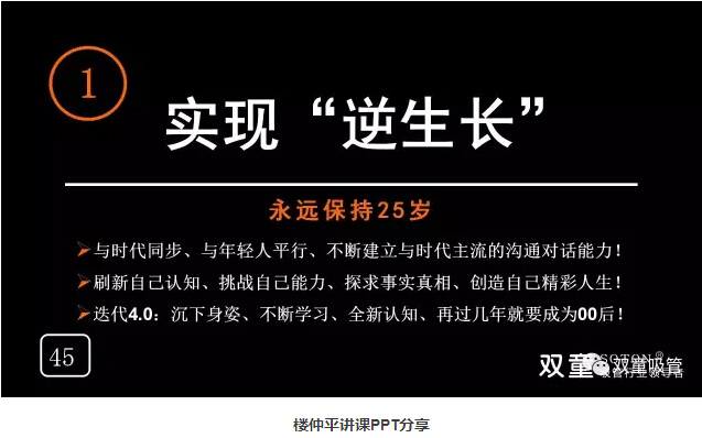 實(shí)現“逆生長(cháng)”:“雙童”樓仲平通過(guò)不斷的到各地演講寫(xiě)課件鍛煉自己,嘗試新的突破,喜歡挑戰新的東西,永遠將自己定位在25歲,不斷學(xué)習去認知新的世界,去擁抱這個(gè)高速變化的世界,從而影響團隊并保持“雙童”不被淘汰。最后,樓總也鼓勵在座的企業(yè)主們不能老去,要與時(shí)代保持同步,接受不斷變化和挑戰,迎合這個(gè)高度變化的世界!