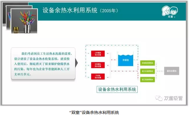 除此之外,“雙童”還設計了雨水收集系統、設備余熱水利用系統、設備余熱采集系統、垃圾分類(lèi)等節能降耗設施,這些節能降耗設施不僅每年能為公司節省200多萬(wàn)元的費用支出,而且讓“雙童”成為了綠色環(huán)保的生態(tài)花園式工廠(chǎng)!