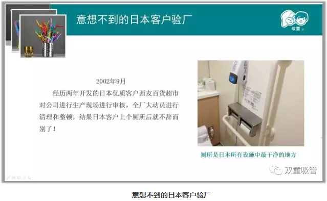 2002年9月,“雙童”花了兩年時(shí)間之久開(kāi)發(fā)的日本優(yōu)質(zhì)客戶(hù)要對公司生產(chǎn)現場(chǎng)進(jìn)行審核。為此,“雙童”進(jìn)行了全廠(chǎng)大動(dòng)員,把當時(shí)北苑路3號租用廠(chǎng)房的里里外外都打掃得干干凈凈!終于,日本客戶(hù)到了,樓仲平在辦公室里等了許久卻被告知:日本客戶(hù)上個(gè)廁所后就不辭而別了!事后公司才了解到,原來(lái),日本人最注重的就是廁所衛生,而當時(shí)“雙童”是租用的廠(chǎng)房廁所硬件條件有限,他們認為一個(gè)連廁所都不干凈的企業(yè)做不出高品質(zhì)的產(chǎn)品!