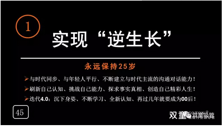 未來(lái)已來(lái),“雙童”樓仲平在面對這個(gè)瞬息萬(wàn)變的現代信息社會(huì )時(shí),充滿(mǎn)了緊迫感和進(jìn)取心,他意識到唯有持續學(xué)習、不斷改變才能緊跟時(shí)代發(fā)展,唯有嘗試新的突破,轉變自己的思維,永遠將自己定位在25歲,才能完成下一次向00后的迭代,從而影響團隊并保證“雙童”不被時(shí)代所淘汰!