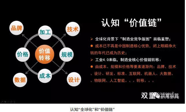 在全球化的背景下,成本不再是制造業(yè)的核心優(yōu)勢。企業(yè)必須面對時(shí)代的不斷變化,產(chǎn)業(yè)發(fā)展“棲”水草而居,中國制造商業(yè)競爭“價(jià)值鏈”轉移逐漸從“規模型”向“價(jià)值型”轉變。企業(yè)經(jīng)營(yíng)“核心價(jià)值鏈”轉移,由成本、價(jià)格、設備、產(chǎn)品等要素逐漸轉向品牌、渠道、標準、研發(fā)、數據、互聯(lián)網(wǎng)…… 傳統業(yè)主杯具時(shí)代已經(jīng)來(lái)臨:經(jīng)驗逐漸成為毒藥!