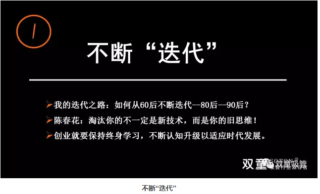 現代商業(yè)知識的認知周期已縮短到3.2年,我們不能用小孩的思維來(lái)認知成人面對的事物,更不能用幾十年前的認知來(lái)理解今天的社會(huì )。每個(gè)人的成長(cháng)伴隨著(zhù)不斷的否定,在認知、糾錯、不斷改變下實(shí)現自我成長(cháng)。“創(chuàng )業(yè)者”最應該有“時(shí)間軸”的概念,需要擁有自我蛻變的能力,否則你就很難成長(cháng)!