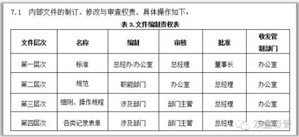 第二層次文件:本公司內部的職能部門(mén)之間對某一活動(dòng)的聯(lián)系方式的描述,有關(guān)經(jīng)營(yíng)管理活動(dòng)步驟的規范;