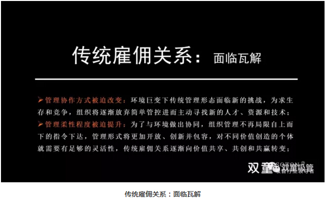 在新時(shí)代背景下,管理進(jìn)入了信息管理時(shí)代,組織管理逐漸扁平化,員工管理逐漸互聯(lián)化,員工與組織形成共生關(guān)系。通過(guò)這樣的轉變,傳統雇傭關(guān)系面臨瓦解,管理協(xié)作方式被迫改變,組織將逐漸放棄簡(jiǎn)單管控進(jìn)而主動(dòng)尋找新的人才、資源和技術(shù)。管理形式也將更加開(kāi)放、創(chuàng )新并包容,對不同價(jià)值創(chuàng )造的個(gè)體就需要有足夠的靈活性,傳統雇傭關(guān)系逐漸向價(jià)值共享、共創(chuàng )和共贏(yíng)轉變!