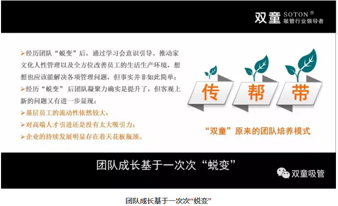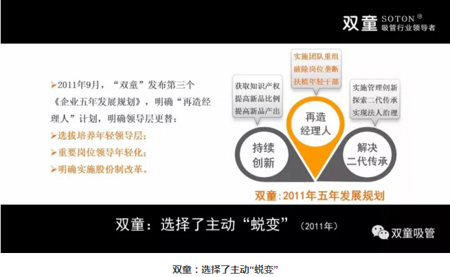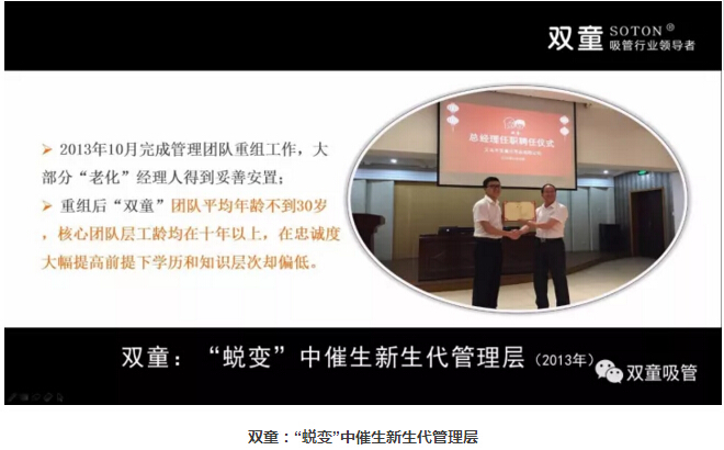 面對這樣的現狀,“雙童”選擇了主動(dòng)“蛻變”,在2011年發(fā)布了第三個(gè)《企業(yè)五年發(fā)展規劃》,明 確“再造經(jīng)理人”計劃,明確領(lǐng)導層更替:選拔培養年輕領(lǐng)導層、重要崗位領(lǐng)導年輕化、明確實(shí)施股份制改革,慢慢解決管理層老化問(wèn)題!重組后的“雙童”團隊平均年齡不到三十歲,大部分核心團隊的工齡在十年以上,學(xué)歷、知識層次和忠誠度大幅提高!