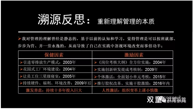 “雙童”經(jīng)歷團隊“蛻變”后,通過(guò)學(xué)習會(huì )意識引導、推動(dòng)家文化人性管理以及全方位改善員工的生活生產(chǎn)環(huán)境,提升團隊認知意識和凝聚力!經(jīng)歷“蛻變” 后團隊凝聚力確實(shí)有所提升,但客觀(guān)上基層員工的流動(dòng)性依然較大,對高端人才引進(jìn)還是沒(méi)有太大吸引力,企業(yè)的持續發(fā)展明顯存在著(zhù)天花板瓶頸。
