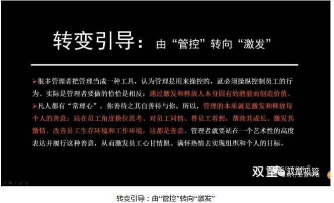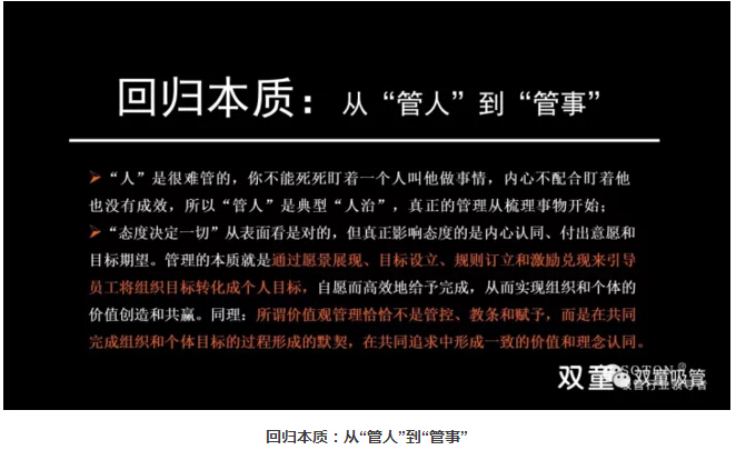 管理的本質(zhì)是“管事”而非“管人”,通過(guò)愿景展現、目標設立、規則訂立和激勵兌現來(lái)引導員工將組織目標轉化成個(gè)人目標,自愿而高效地給予完成,從而實(shí)現組織和個(gè)體的價(jià)值創(chuàng )造和共贏(yíng)。同時(shí),通過(guò)培訓、授權和激勵,激發(fā)和釋放人本身固有的潛能而創(chuàng )造價(jià)值。所以,管理的本質(zhì)管理不是管控、教條和賦予,而是在共同完成組織和個(gè)體目標的過(guò)程形成的默契,在共同追求中形成一致的價(jià)值和理念認同。