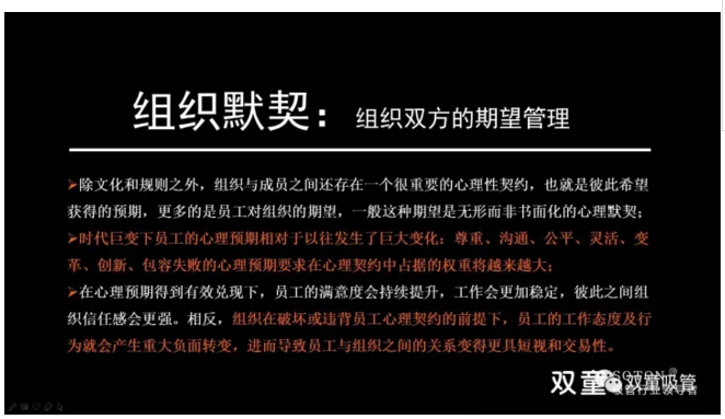 組織默契,組織雙方的期望管理:除了文化和規則之外,組織與成員之間還存在一個(gè)很重要的心理性契約,也就是彼此希望獲得的預期,更多的是員工對組織的期望。