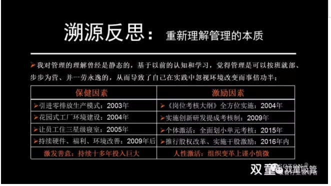 溯源反思,重新理解管理的本質(zhì):樓仲平分享道:“我對管理的理解曾經(jīng)是靜態(tài)的,基于以前的認知和學(xué)習,覺(jué)得管理是可以按部就班、步步為營(yíng)、并一勞永逸的,從而導致了自己在實(shí)踐中忽視環(huán)境改變而事倍功半。”現在,樓仲平也一直在反思,重新理解管理的本質(zhì)!