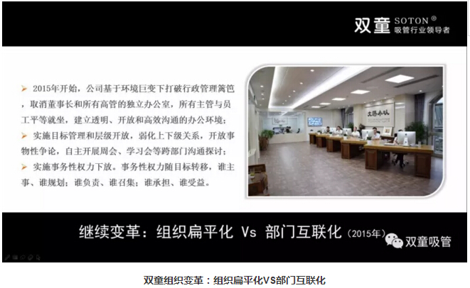 “雙童”組織變革:基于時(shí)代的改變和挑戰,“雙童”從2015年開(kāi)始,對原有組織形式進(jìn)行思考、實(shí)踐和探索,逐漸打破行政管理籬笆,通過(guò)平等、透明、開(kāi)放的辦公環(huán)境,消除部門(mén)之間的隔閡,實(shí)施目標管理和層級開(kāi)放,弱化上下級關(guān)系,自主開(kāi)展周會(huì )等跨部門(mén)溝通探討,提升部門(mén)工作效率。同時(shí),實(shí)施事務(wù)性權力下放,大家以解決事務(wù)為核心,讓權力隨事務(wù)轉移,誰(shuí)主事、誰(shuí)規劃;誰(shuí)負責、誰(shuí)召集;誰(shuí)承擔、誰(shuí)受益,一切以工作結果為導向,也實(shí)現了跨部門(mén)互通互聯(lián)、共同探討!