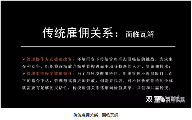 傳統管理模式,終結時(shí)代來(lái)臨:在新時(shí)代背景下,管理進(jìn)入了信息管理時(shí)代,傳統雇傭關(guān)系面臨瓦解,管理協(xié)作方式逐漸改變,員工與組織的雇傭關(guān)系逐漸變成了共生關(guān)系。管理形式也將更加開(kāi)放、創(chuàng )新并包容,對不同價(jià)值創(chuàng )造的個(gè)體就需要有足夠的靈活性,傳統雇傭關(guān)系逐漸向價(jià)值共享、共創(chuàng )和共贏(yíng)轉變!