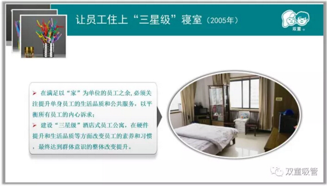 正巧從2006年開(kāi)始,“雙童”在建廠(chǎng)之初建設的雨水收集、中水回用等節能降耗設施以及創(chuàng )造一流硬件讓員工住三星級寢室、建設物業(yè)團隊服務(wù)員工、倡導“家文化”解決核心員工家庭生活問(wèn)題等善待員工的經(jīng)營(yíng)理念受到了中央、省和市政府的高度關(guān)注,從而帶動(dòng)大量社會(huì )媒體到“雙童”采訪(fǎng)報道。