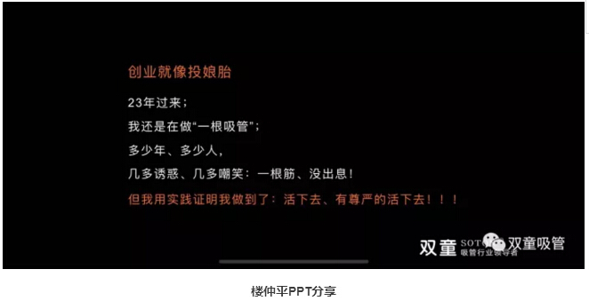 “雙童”樓仲平的演講主題是《一根吸管”的創(chuàng )業(yè)觀(guān)》,精彩分享引起了在場(chǎng)創(chuàng )業(yè)者們的高度認同。下面,吸管妞就和大家分享精彩的課程內容吧!