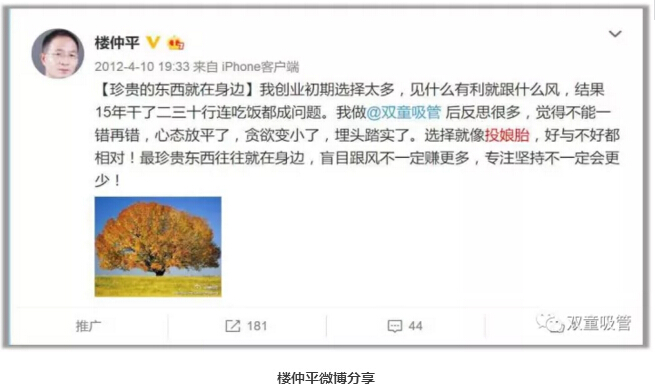 樓仲平回憶自己曾在2012年發(fā)布的微博中表明:“我在創(chuàng )業(yè)初期選擇太多,見(jiàn)什么有利就跟什么風(fēng),結果15年干了二三十行,一事無(wú)成。做雙童吸管后常反思,心態(tài)放平了,貪欲變小了,埋頭踏實(shí)了。”