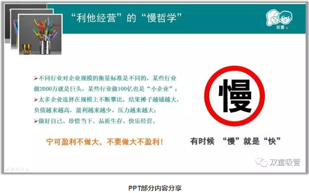 >>>> “利他經(jīng)營(yíng)”的慢哲學(xué):太多企業(yè)選擇在規模上不斷攀比,結果攤子越鋪越大,負債越來(lái)越高,盈利越來(lái)越少,壓力越來(lái)越大。其實(shí)“慢”的本質(zhì)是不犯錯誤少走彎路,不斷積累,有時(shí)候“慢”就是“快”!