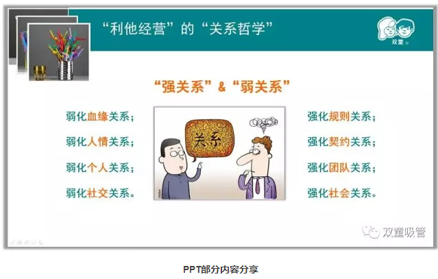 >>>> “利他經(jīng)營(yíng)”的“關(guān)系哲學(xué)”:企業(yè)如何通過(guò)引導讓關(guān)系達到最優(yōu)配置?“雙童”樓仲平十分注重關(guān)系哲學(xué),通過(guò)弱化血緣關(guān)系,強化規則關(guān)系;弱化人情關(guān)系,強化契約關(guān)系;弱化個(gè)人關(guān)系,強化團隊關(guān)系;弱化社交關(guān)系,強化社會(huì )關(guān)系,從而為企業(yè)持續發(fā)展創(chuàng )造良好條件!
