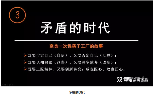 >>>> “矛盾”的時(shí)代:“雙童”樓仲平通過(guò)日本奈良一次性筷子的故事告訴大家成也工匠精神、敗也工匠精神,沒(méi)有改變,“工匠”精神也沒(méi)有用。作為創(chuàng )業(yè)者來(lái)講,我們不能用過(guò)往的經(jīng)驗來(lái)理解發(fā)生的一切,否則你會(huì )被時(shí)代所拋棄。在不同的時(shí)代,你對時(shí)間和技術(shù)進(jìn)步的理解是不一樣的,既要肯定自己、又要否定自己;既要認知積累、又要清空放棄;既要工匠精神、又要創(chuàng )新轉變!