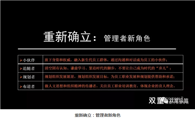 “雙童”樓仲平在分享《新生代員工價(jià)值觀(guān)管理》課件中分享了對于管理“新生代員工”的建議。