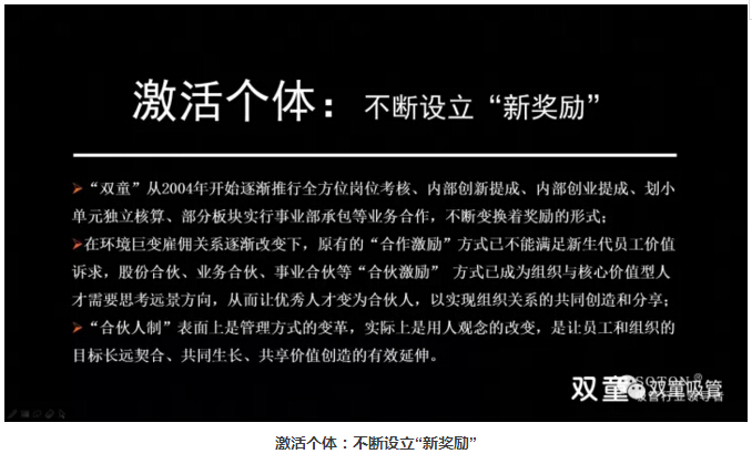 激活組織的同時(shí),“雙童”也在激活個(gè)體上絞盡腦汁,不斷設置“新獎勵”。公司從2004年開(kāi)始逐漸推行全方位崗位考核、內部創(chuàng )新提成、內部創(chuàng )業(yè)提成、劃小單元獨立核算、部分板塊實(shí)行事業(yè)部承包等業(yè)務(wù)合作,不斷變換著(zhù)獎勵的形式。同時(shí),股份合伙、業(yè)務(wù)合伙、事業(yè)合伙等“合伙激勵” 方式已成為組織與核心價(jià)值型人才需要思考遠景方向,從而讓優(yōu)秀人才變?yōu)楹匣锶?,以?shí)現組織關(guān)系的共同創(chuàng )造和分享!