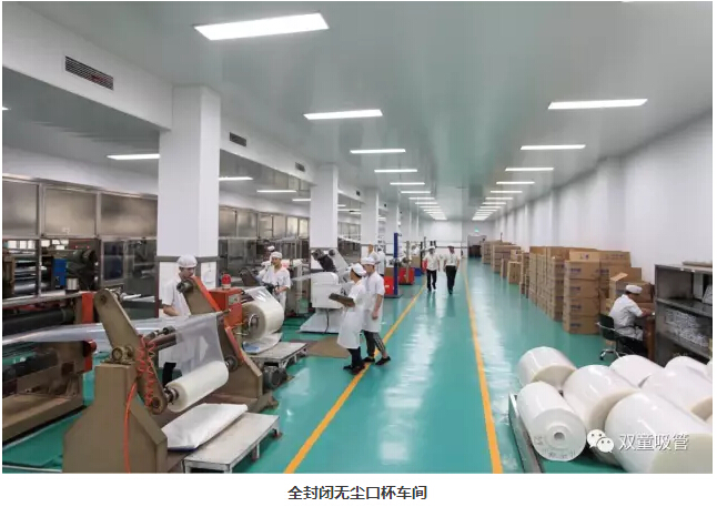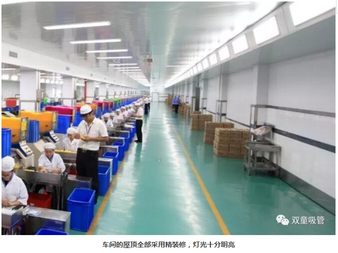 “雙童”車(chē)間的每個(gè)入口,有著(zhù)許多安全、衛生提示的標牌,引導員工門(mén)在進(jìn)入車(chē)間時(shí)要注意安全和衛生防護工作。進(jìn)入車(chē)間內部,一列列整齊的機器、一箱箱五顏六色的吸管、一條條清晰分明的分界線(xiàn),車(chē)間內全部安裝了恒溫空調,屋頂全部進(jìn)行精裝修寬敞明亮,柱子和地腳線(xiàn)用不銹鋼進(jìn)行包邊,大大增加了建筑年限。所有員工皆穿著(zhù)潔白的工作服,正在忙碌地進(jìn)行生產(chǎn)工作。