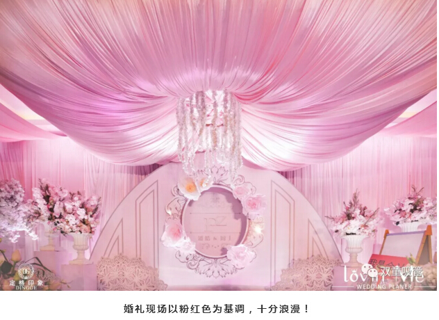 婚禮現場(chǎng)裝飾以粉紅色為基調,非常浪漫?;檠缦_(kāi)50桌,來(lái)賓們共同見(jiàn)證一對新人的幸福時(shí)刻!