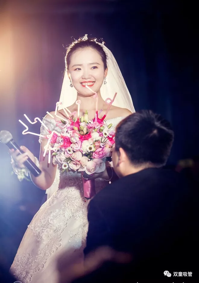 細心的粉絲一定發(fā)現了新娘吸管妞手中的捧花有所不同,這是新郎特地準備的愛(ài)心吸管花。新郎說(shuō):“捧花里用的是雙童吸管的愛(ài)心情侶吸管。很多人都叫周上吸管妞,所以我覺(jué)得在今天的場(chǎng)合,送給吸管妞一束特別的愛(ài)心吸管花,她應該會(huì )很開(kāi)心?!贝嗽?huà)一出,現場(chǎng)響起了熱烈的掌聲,婚禮也進(jìn)入了高潮。