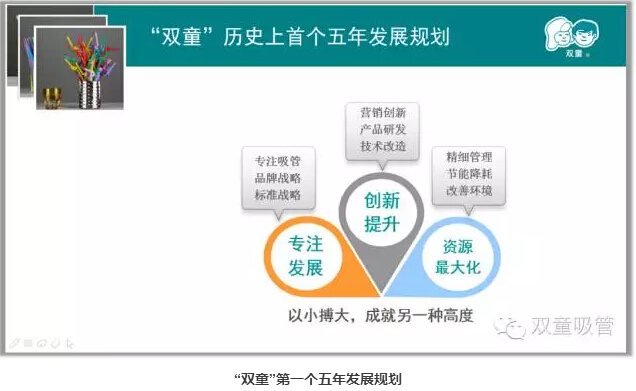 所以,“雙童”在這樣的背景下,提出了“以小博大,成就另一種高度”這句企業(yè)座右銘,來(lái)引領(lǐng)和激勵企業(yè)的發(fā)展。正是在這句座右銘的引導下,“雙童”摒棄了浮躁,抗拒了誘惑,通過(guò)不斷地努力、進(jìn)取和創(chuàng )新,把一根小小的吸管做到極致,做成了全球吸管領(lǐng)導者!
